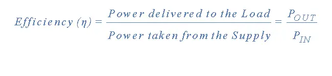 An ideal amplifier would have an efficiency of 100%, meaning the power "IN" would equal the power "OUT". But in reality, that can never happen because some of the power is lost as heat, and the amplifier itself also uses some power in the amplification process. So, the efficiency of an amplifier is given as: