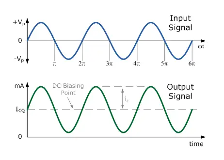 When an input signal is present, the transistor operates normally within its active region, which eliminates the crossover distortion that happens in Class-B amplifiers. A small collector current (ICQ) flows through the transistor when there's no input signal, but it’s way less than the current in a Class-A amplifier.