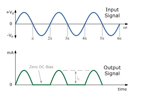 Class-B operation doesn’t use a direct DC bias voltage like Class-A. Instead, the transistor only conducts when the input signal is higher than the base-emitter voltage (VBE), which is about 0.7v for silicon transistors. So, with zero input signal, you get zero output. Since only half of the input signal is amplified, this makes Class-B amplifiers more efficient than Class-A.