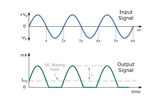 But by adjusting the Base bias voltage, it’s possible to run an amplifier in a different mode, other than full waveform reproduction. This is where different operating ranges and modes come in, and they are categorized by what’s called the Amplifier Class.